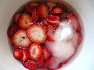 Now add sugar to taste...about 1/2 cup depending on how many strawberries. Let this soak for a few hours or more to let the water turn into strawberry juice!!