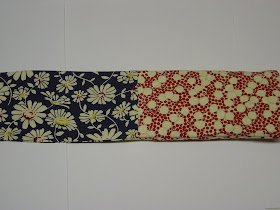 Measurements: 2 pieces of fabric cut 4" x 13.5". In the following pictures I used Moda's Maison de Noel by 3 Sisters (on the left) and Moda's Gingham Rose by 3 Sisters (on the right). I thought one for spring/summer and the darker one for fall/winter.